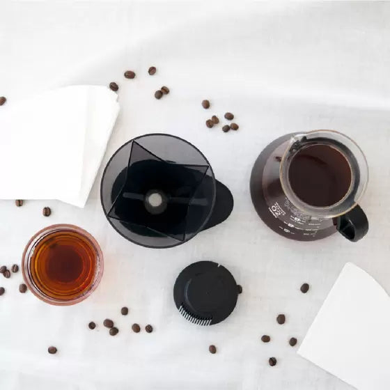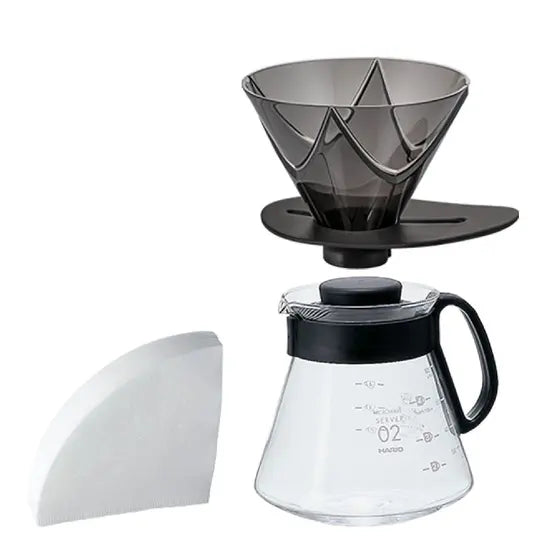 Esse desenho favorece a aderência do filtro de papel nas laterais, o que permite um fluxo mais lento, com mais tempo de contato entre o café e a água. Sendo assim, indicado para um único ataque.