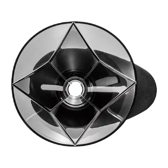 Diferentemente das ranhuras em espiral do V60 tradicional, o Mugen tem ranhuras em forma de estrela, deixando as paredes internas do suporte praticamente lisas.
